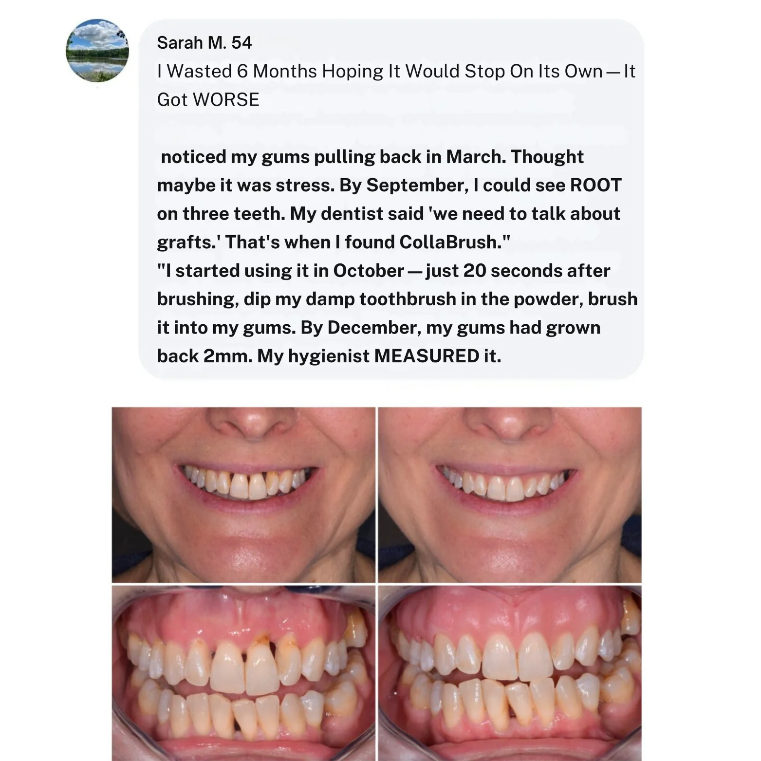 CollaBrush doesn't regrow lost gum tissue (nothing can). It supports tissue strength, helps stop progression, and reduces sensitivity. Think of it as strengthening what you have left and protecting it from further decline.