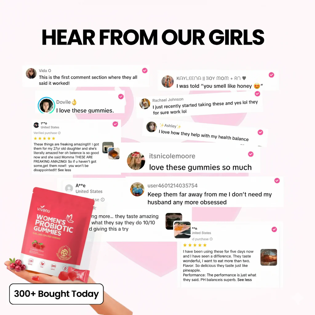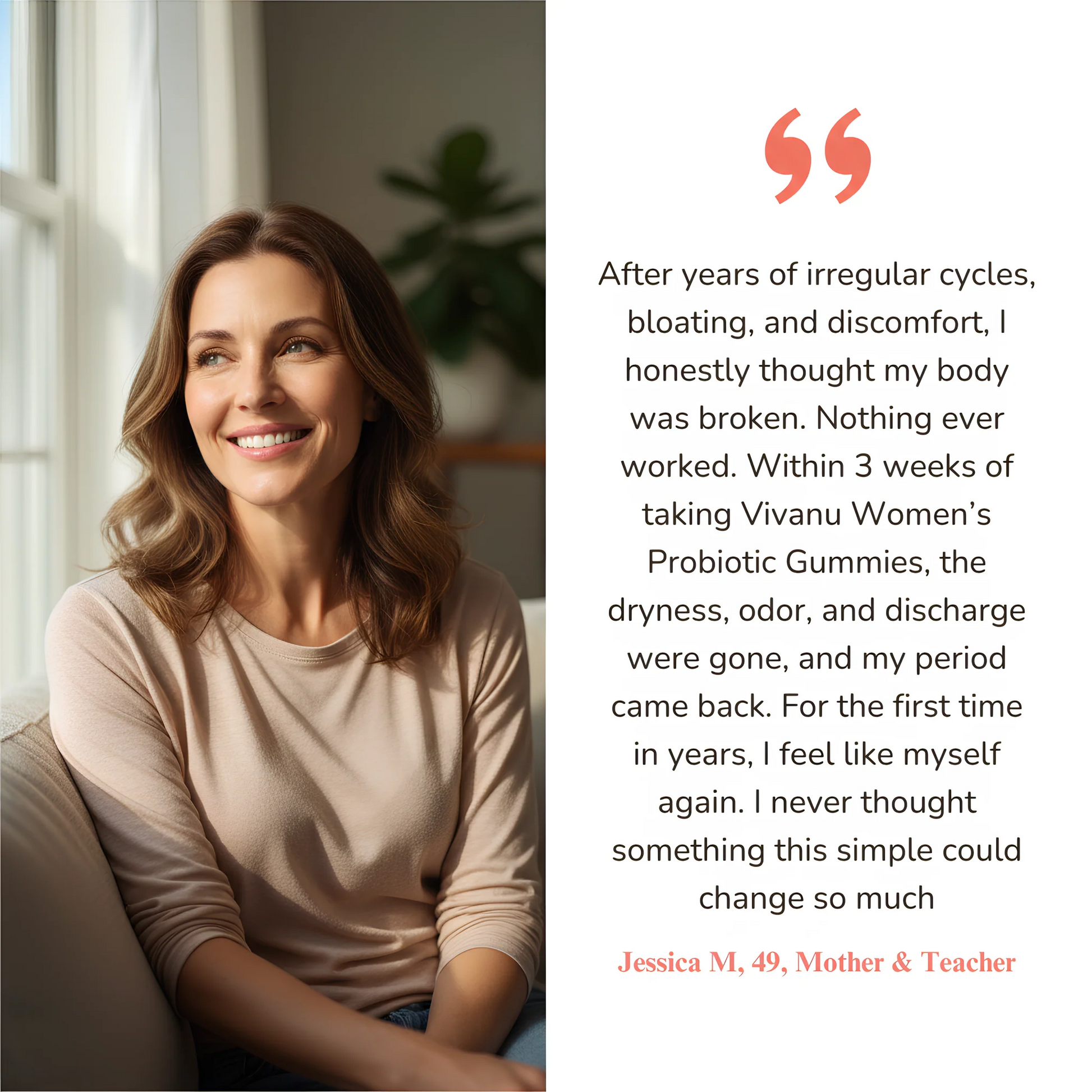 Vivanu targets the missing bacteria with 100 billion CFUs and 18 strains to restore your natural balance and healthy flora. Say goodbye to odor, discharge, and missing periods—hello to feeling clean, fresh, and yourself again every day.