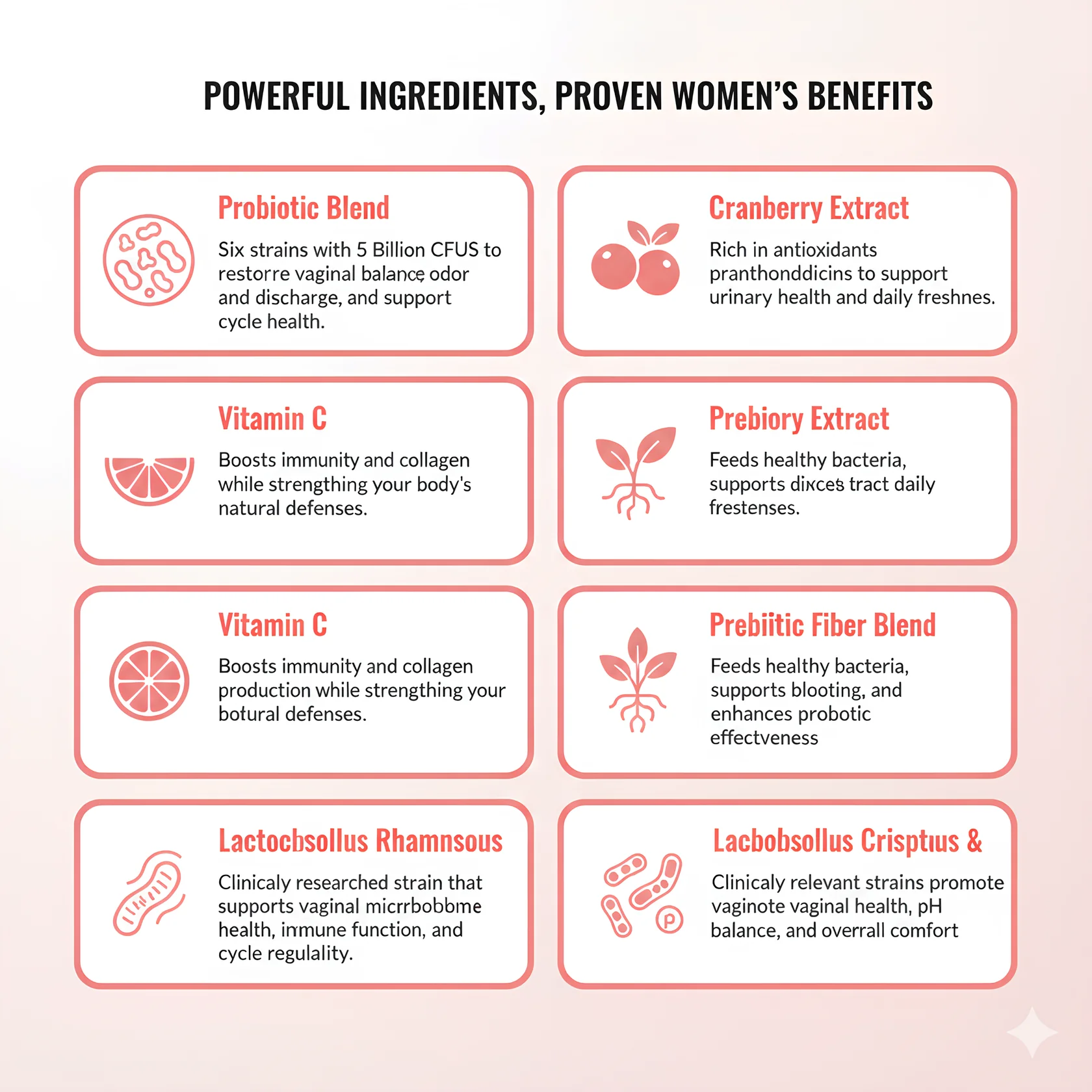 The discharge, the odor, the missing periods—they're not random. They're your body asking for the right support. Six targeted strains, 100 billion CFUs, plus cranberry. Because some women can't afford to wait.